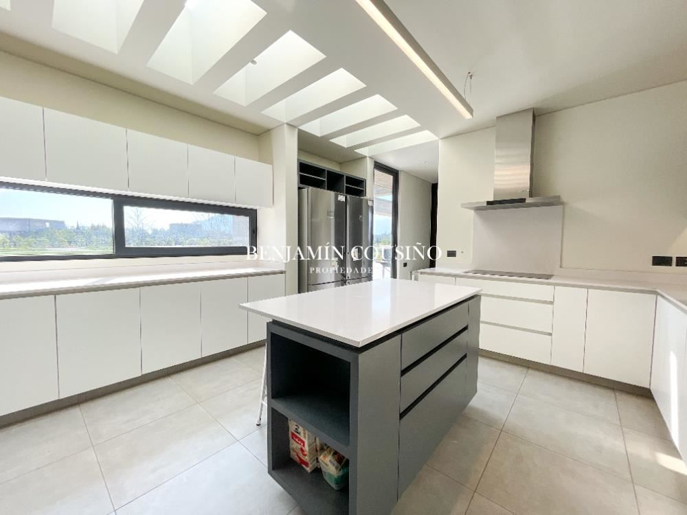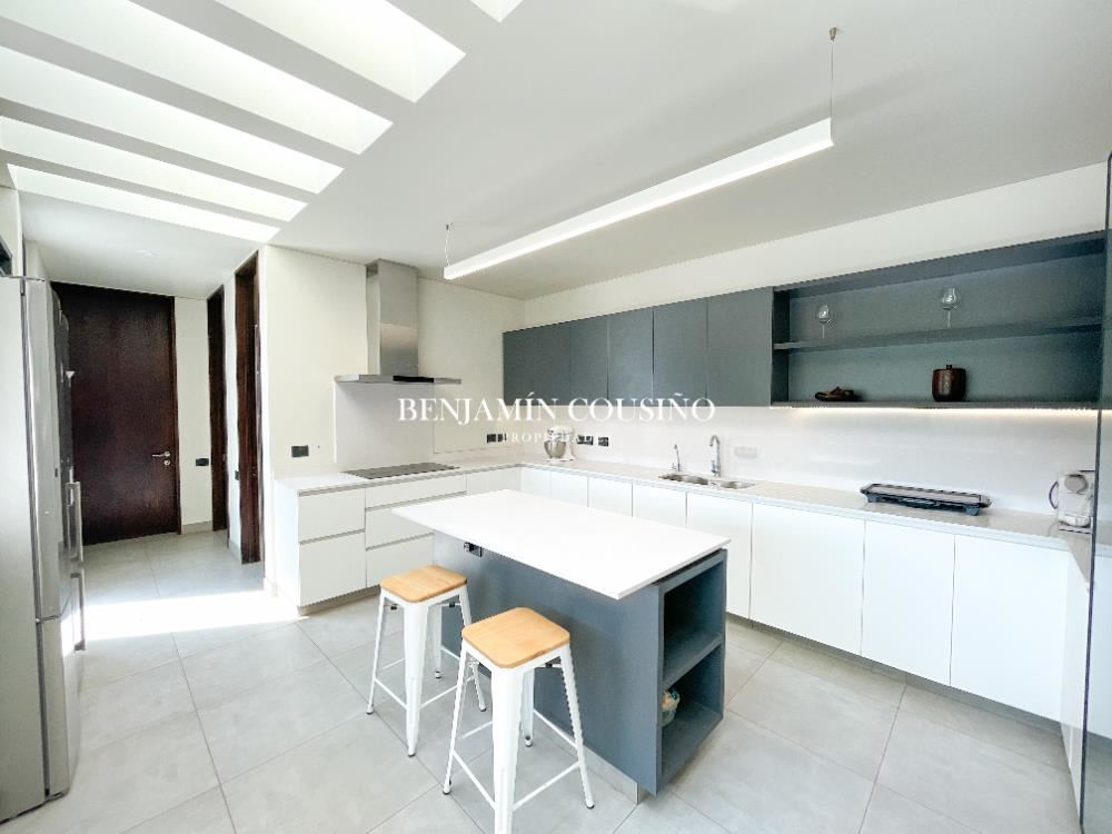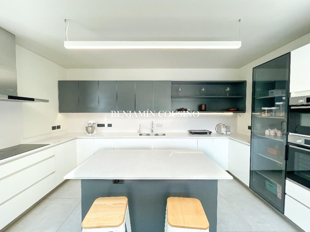 Moderna cocina muy iluminada, con mueble isla, cubiertas de silestone y equipada con encimera, campana, horno eléctrico y microondas empotrado.