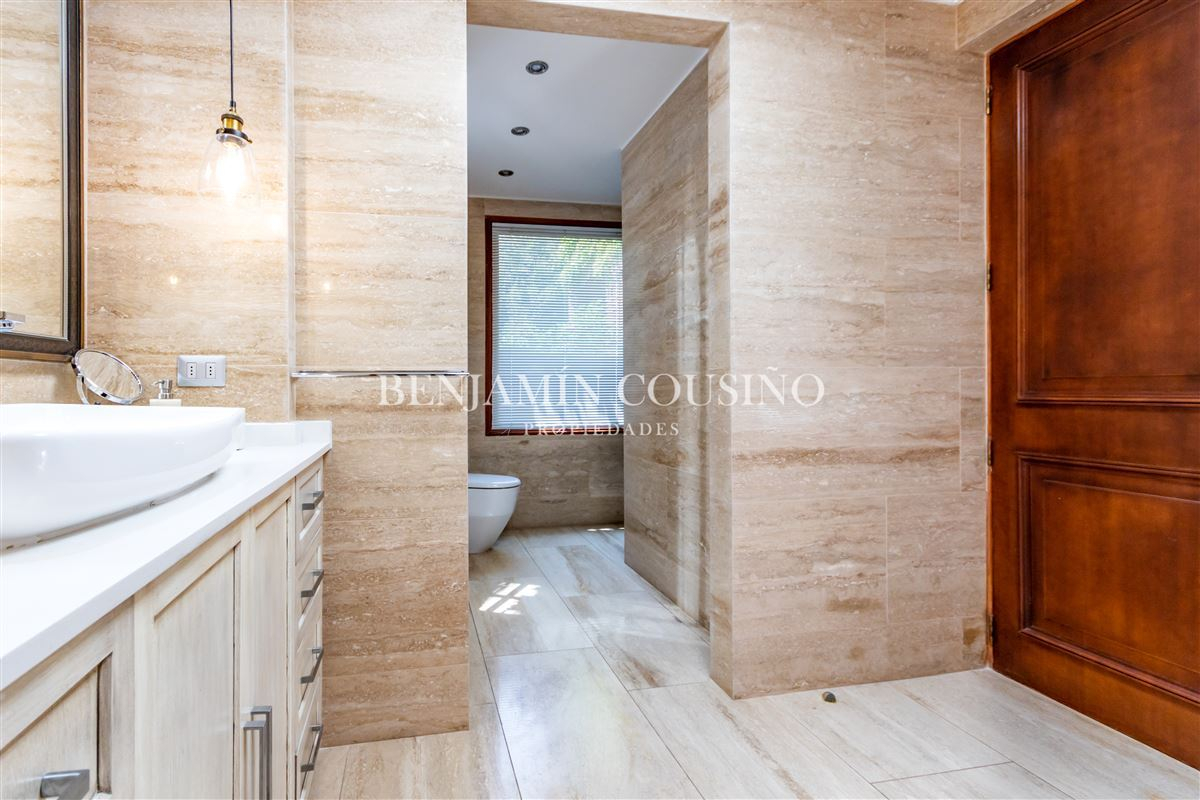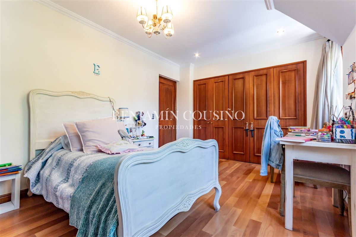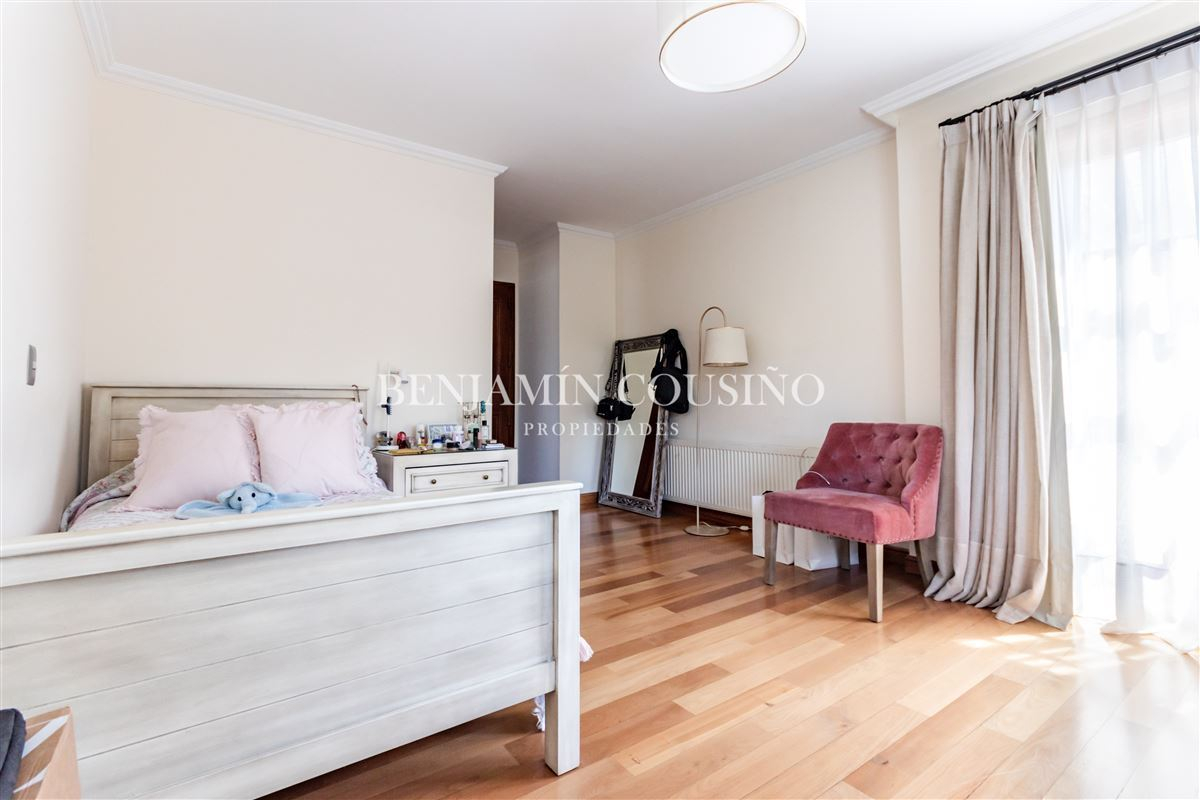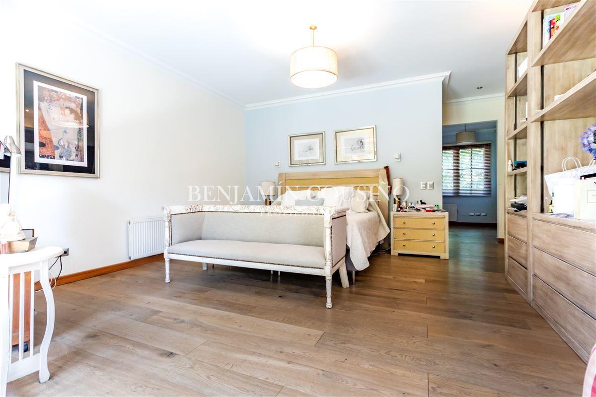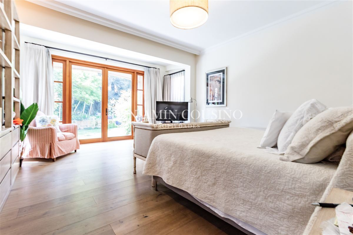 Dormitorio principal en suite con salida a jardines, amplio walking closet y baño con terminaciones en mármol.