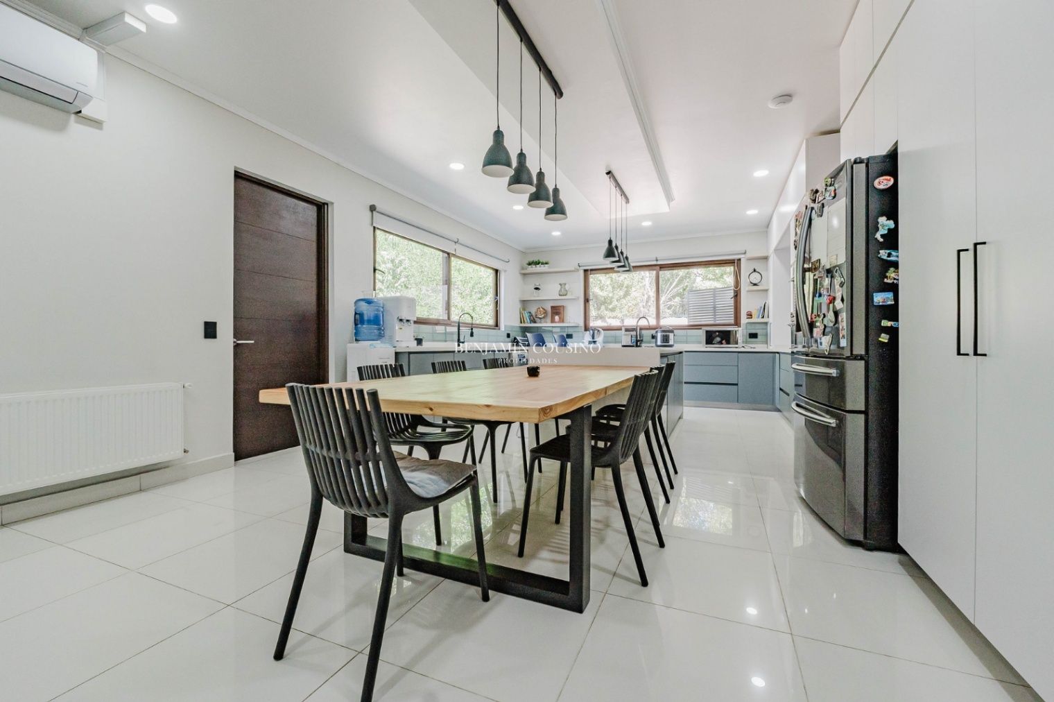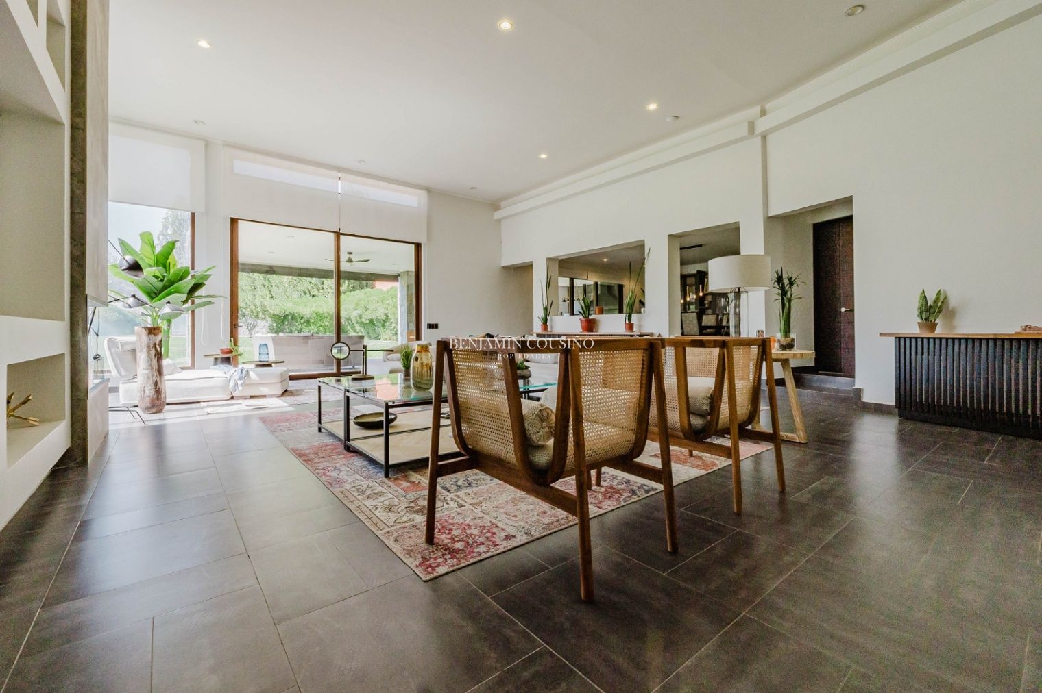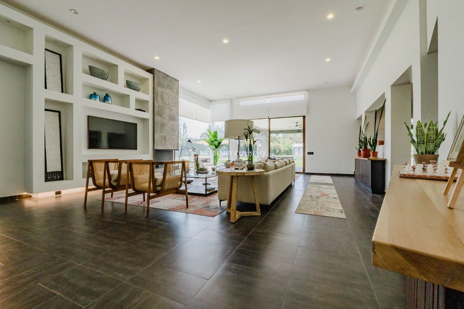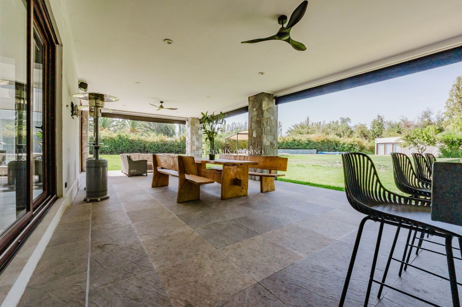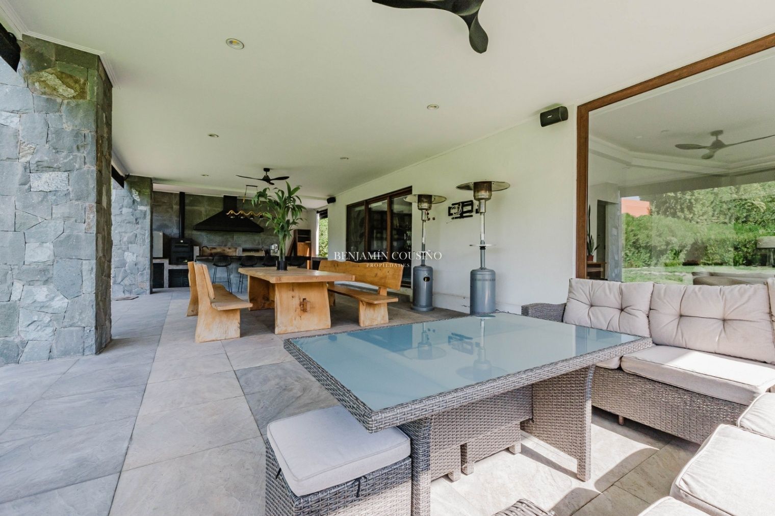 Living con estufa a etanol, ventanales de gran altura y luminosidad, comedor de gran tamaño y separados por muro y peldaño con salida a terraza techada y quincho.