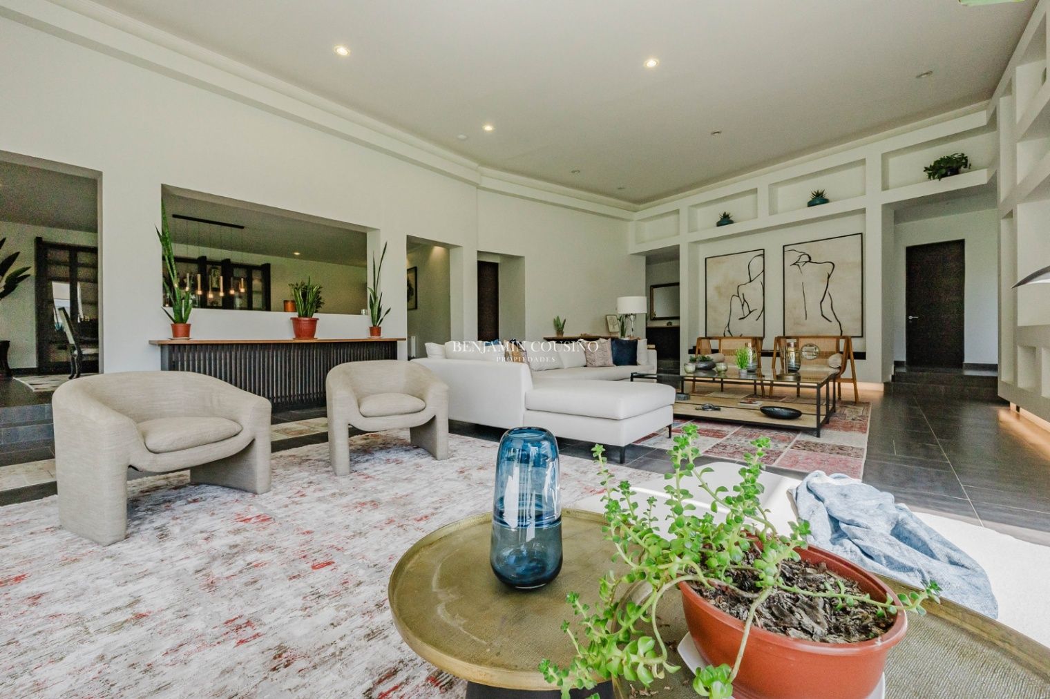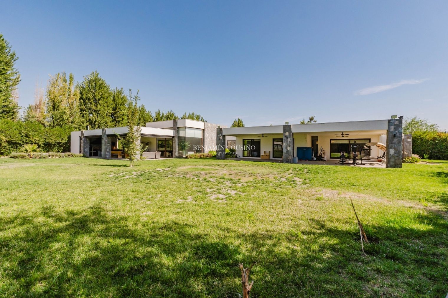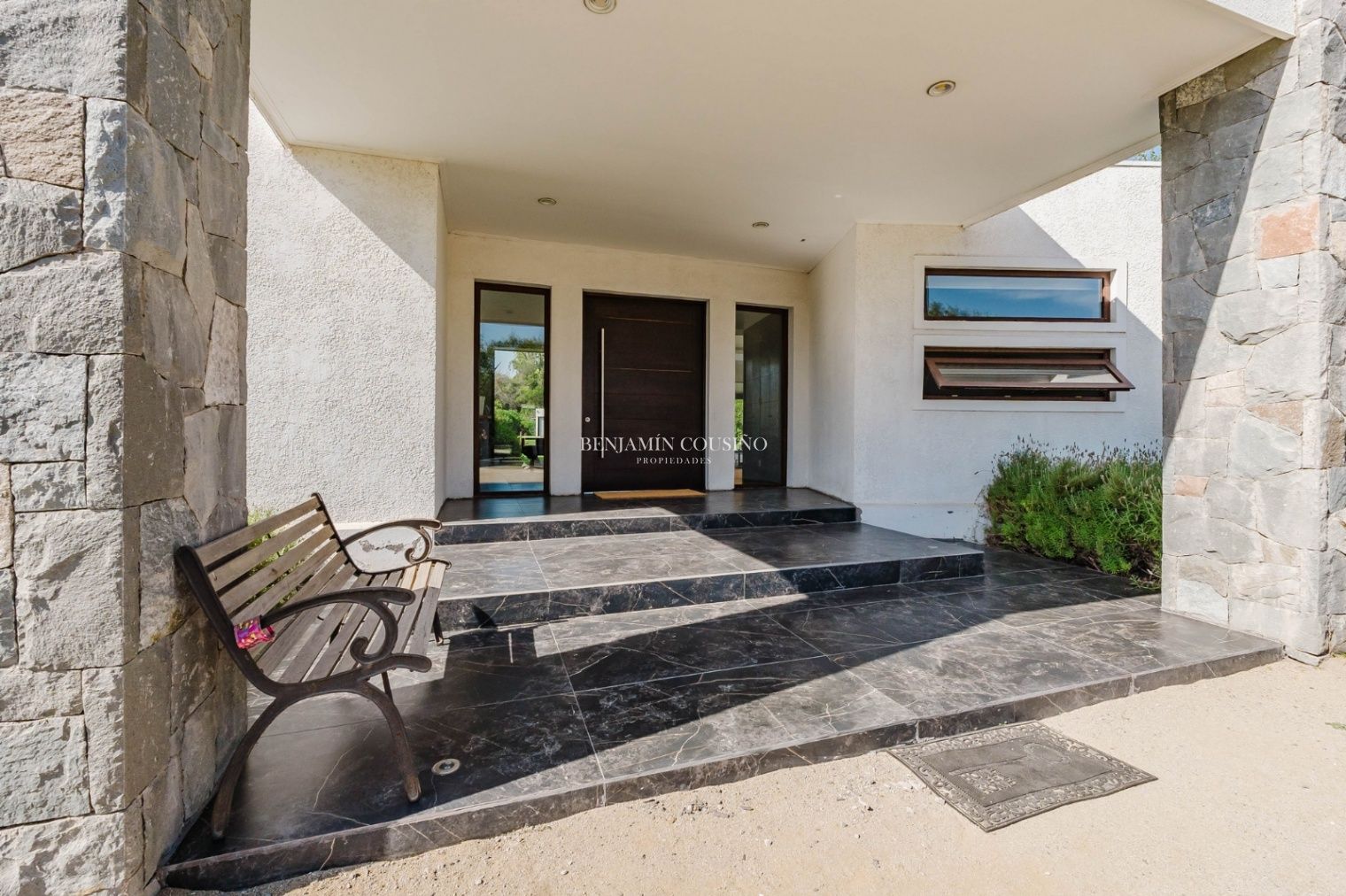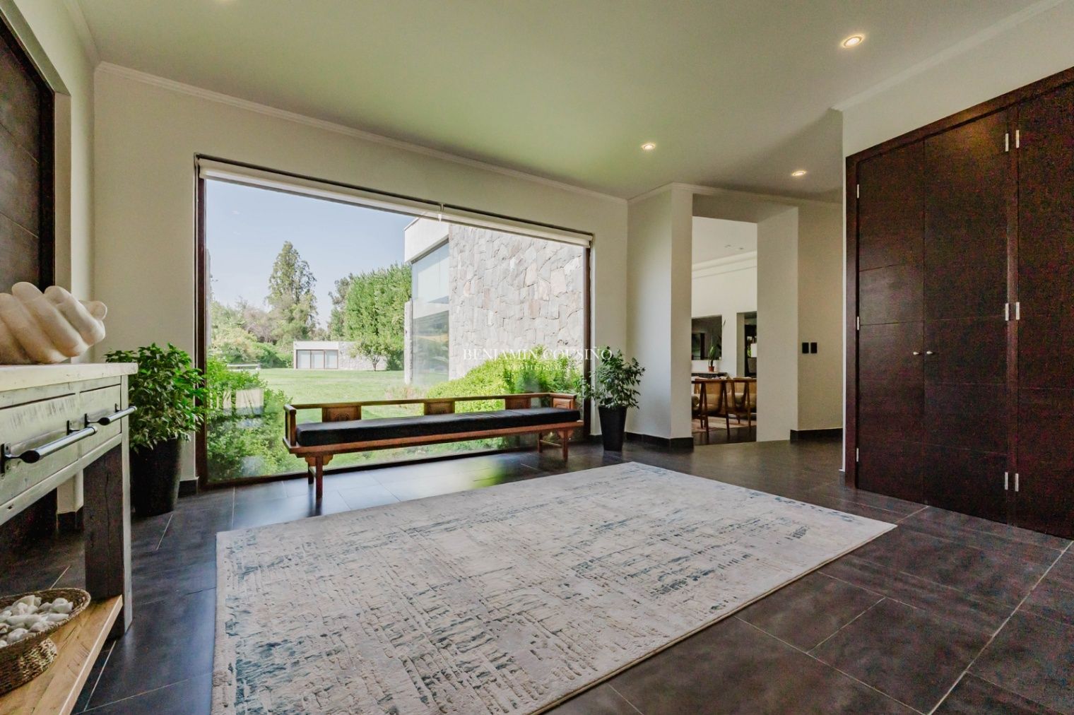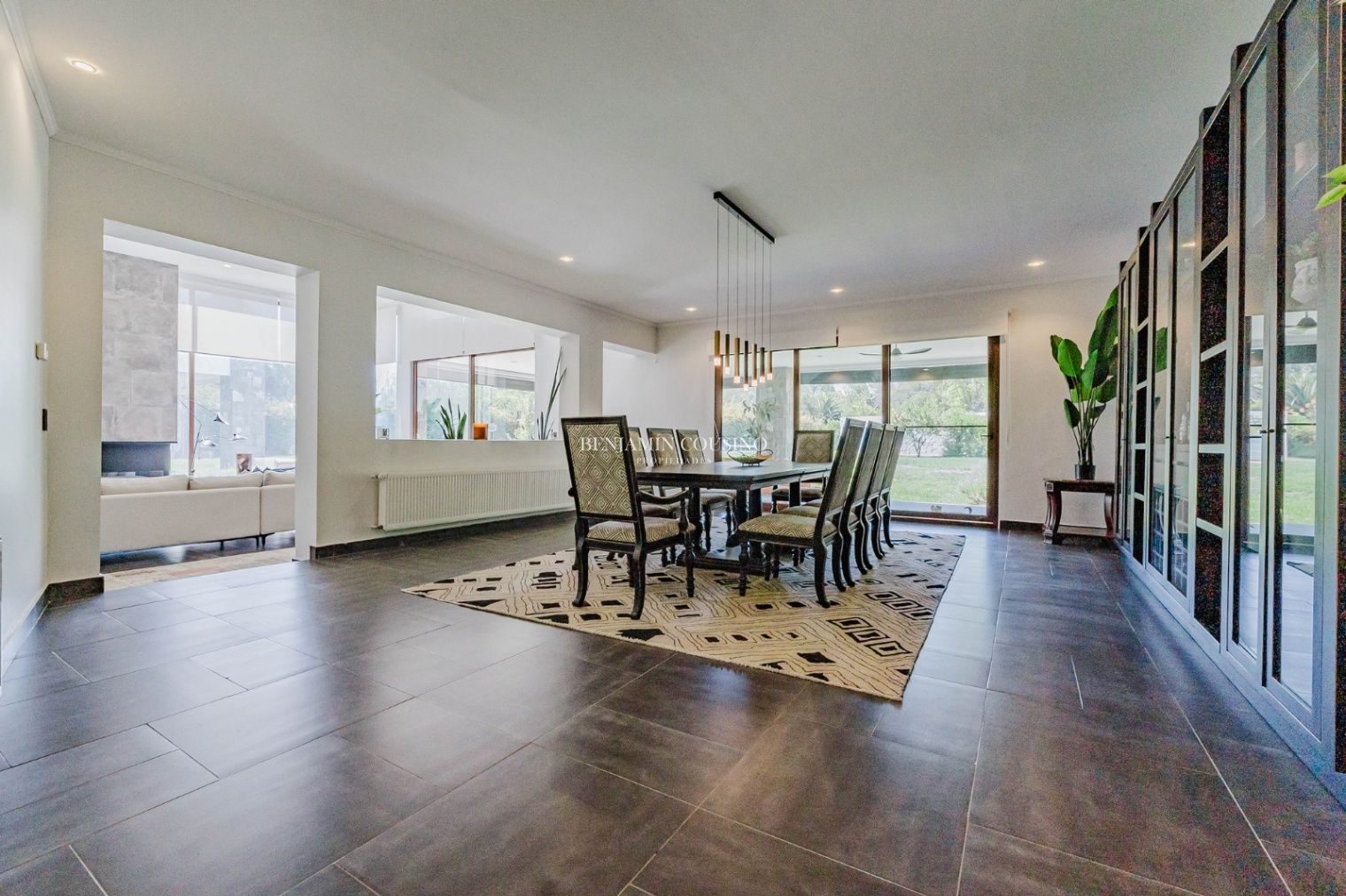 Living con estufa a etanol, ventanales de gran altura y luminosidad, comedor de gran tamaño y separados por muro y peldaño con salida a terraza techada y quincho.
