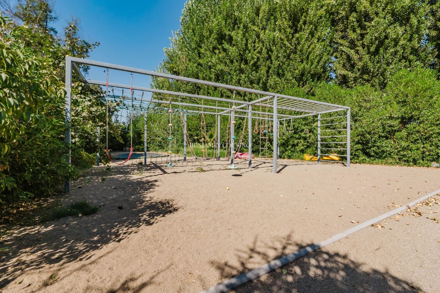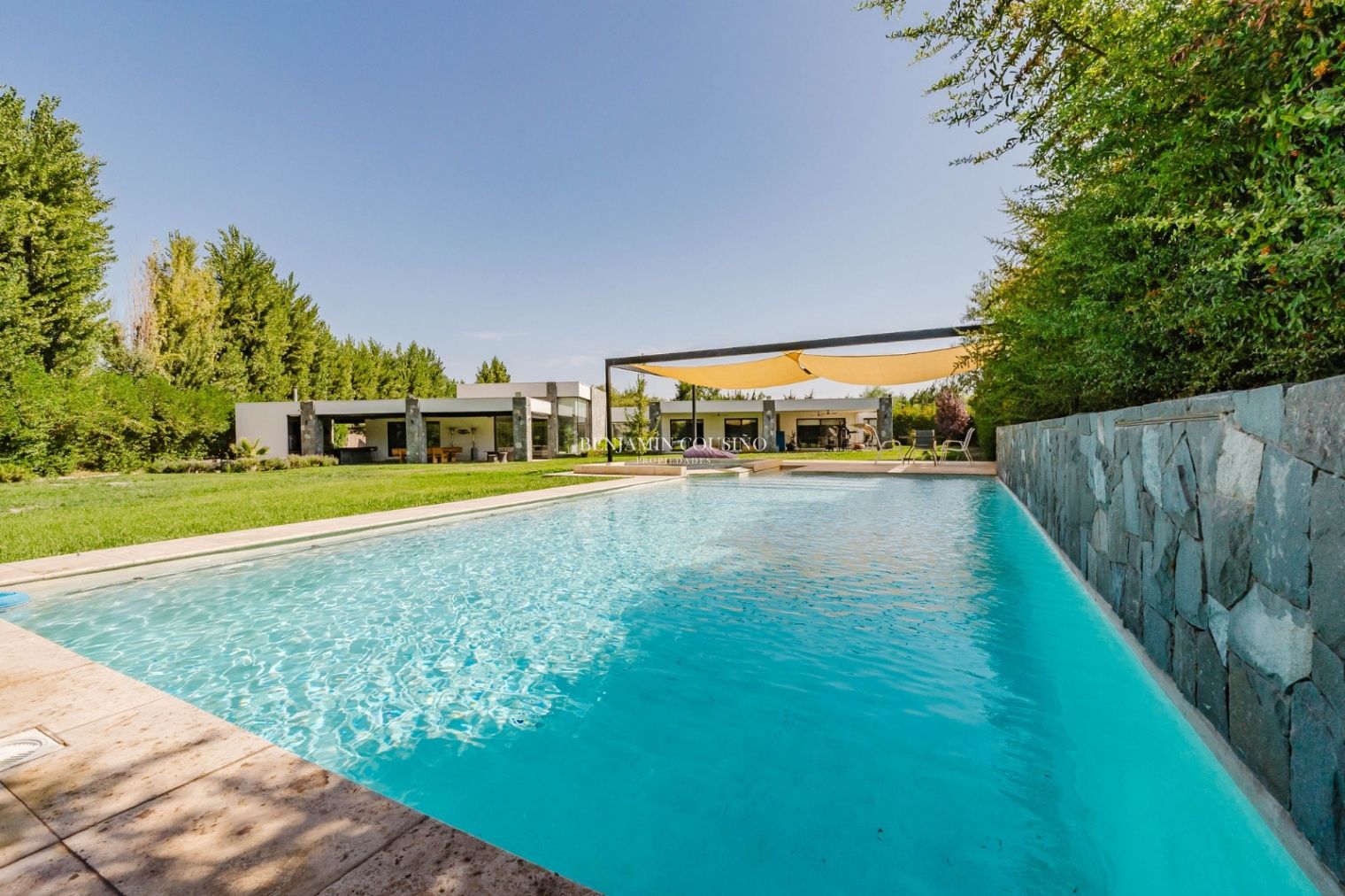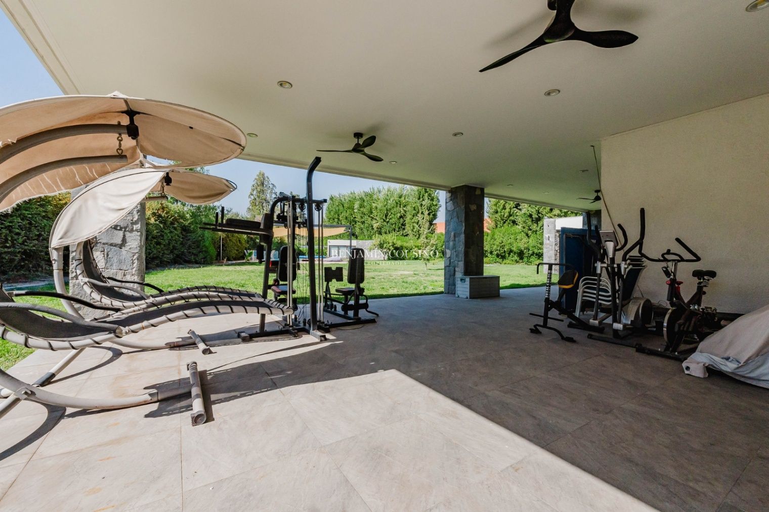 Quincho techado y cerrado , con mesón, lavaplatos, horno, parilla a gas y a leña, baño y bodega.