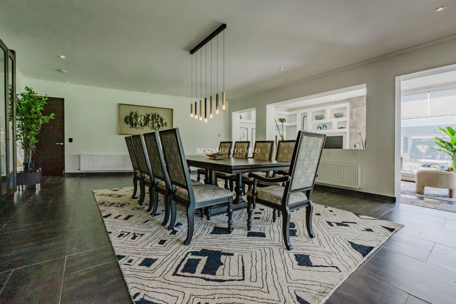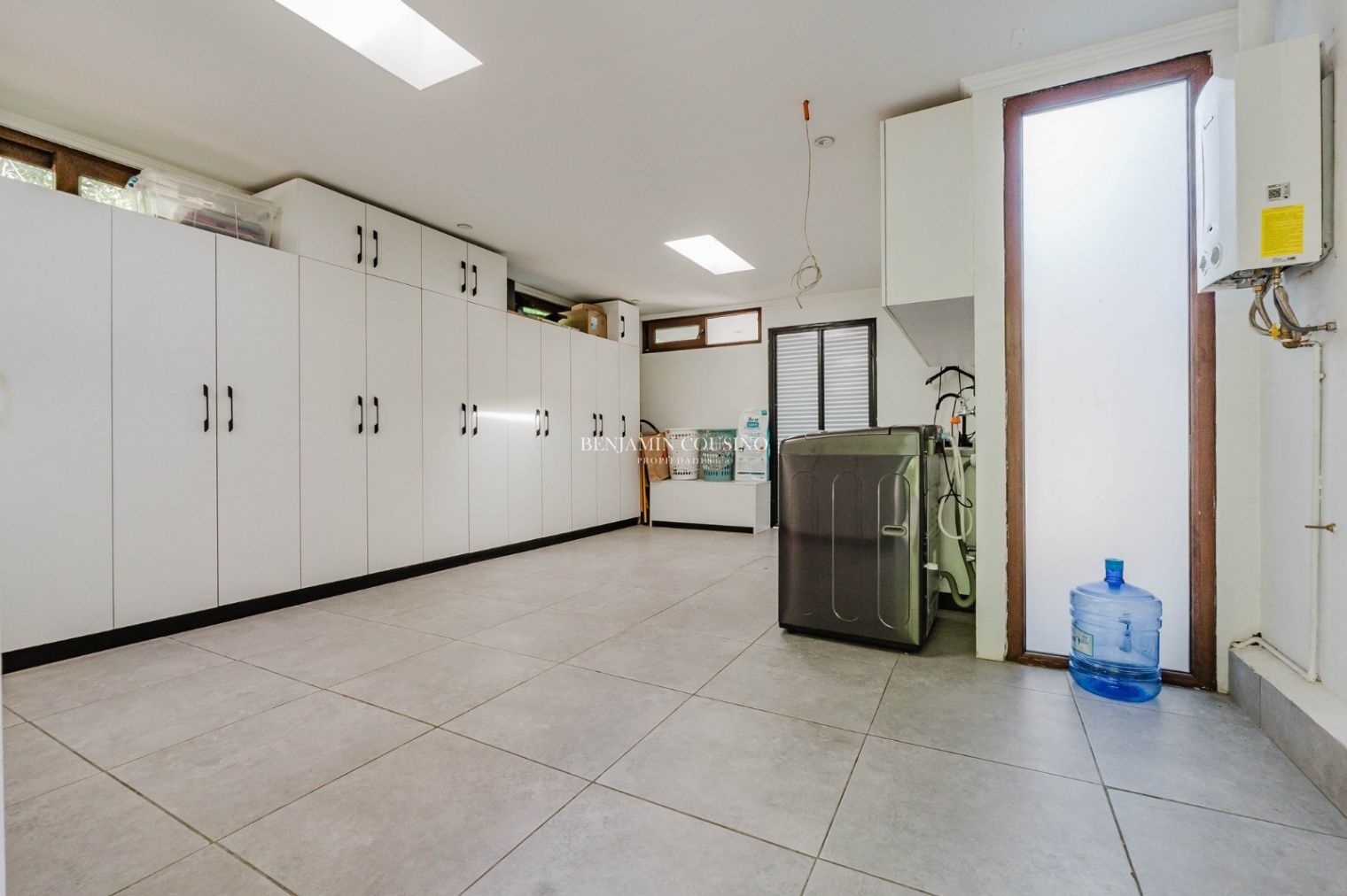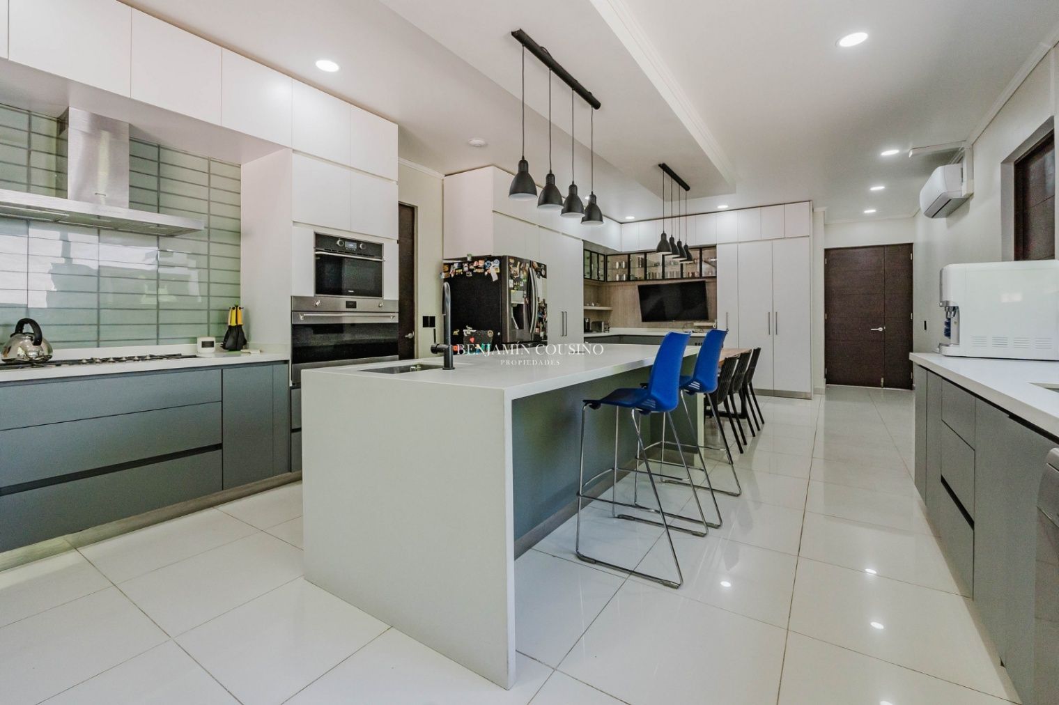 Cocina con gran isla, muebles al techo, cubierta de cuarzo, encimera de 6 platos, campana Smeg, espacio para refrigerador y gran despensa.