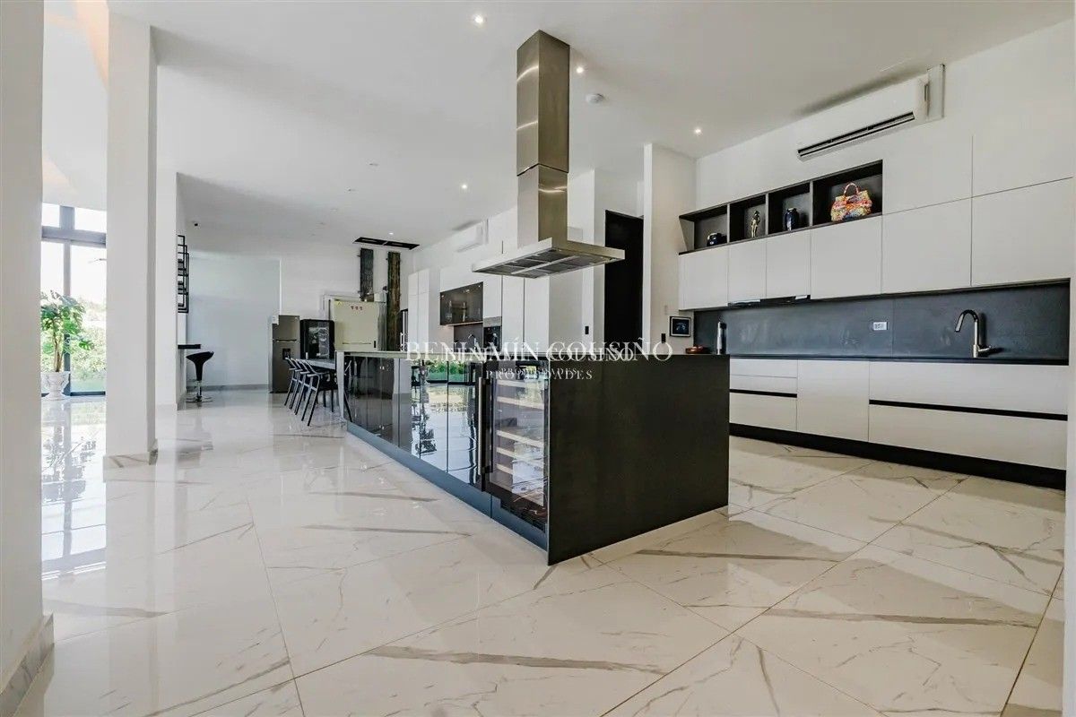 Cocina americana importada de Italia con campana y cocina Miele, isla central con encimera y 2 lavaplatos, cava, dos hornos, cafetera, lavacopas, y espacio para tres refrigeradores.